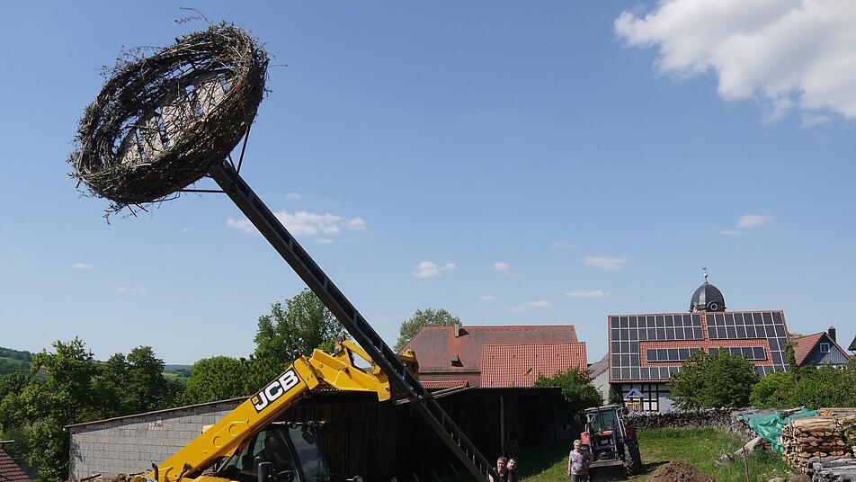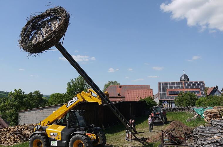 Reinhard Grell und der Gartenbauverein Lahm (Landkreis Coburg) haben im südlichen Itzgrund eine Nisthilfe für Störche aufgestellt.