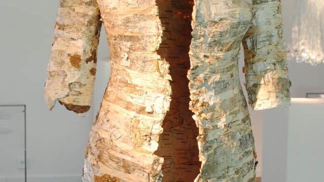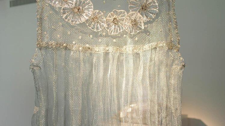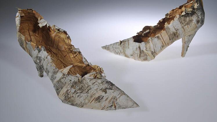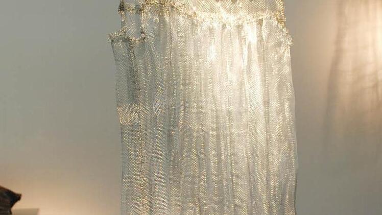 Irritiertes Entzücken löst das Kleidchen aus Metallgitter und Glasblumen von Rike Scholle aus; das wäre sogar tragbar. Andere der in der Rosenau gezeigten "Textilien" sind es nicht, schon gar nicht die schicke Jacke aus Birkenrinde von Charlotte Vögele oder die dazu passenden eleganten Schuhe. Das Spiel mit Alltagsobjekten treibt Shige Fujishiro noch weiter: Er hat Massen an schlichten kleinen Glasperlen auf Sicherheitsnadeln gefädelt, die er zu "Einkaufstüten" verbindet.Das Wegwerfprodukt erscheint nun ungemein edel. Große Fotos mit dem Künstler samt Ausstellungsstück in entsprechendem Kontext, die "Rewe-Tüte" vor dem Einkaufsmarkt, konstruieren eine Geschichte.