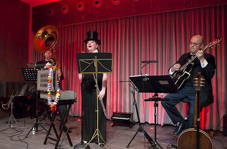Mit wohl dosierter Ironie servieren Jochen Rothermel am Sousaphon, Werner Küspert an Banjo und Gitarre und die Sängerin Nicole Schömig Schlager und Meldoein aus den 20er und 30er Jahren. Ganz nebenbei führen sie dabei vor, wie die Zeit der Weltwirtschaftskrise kreative Geister beflügelte.