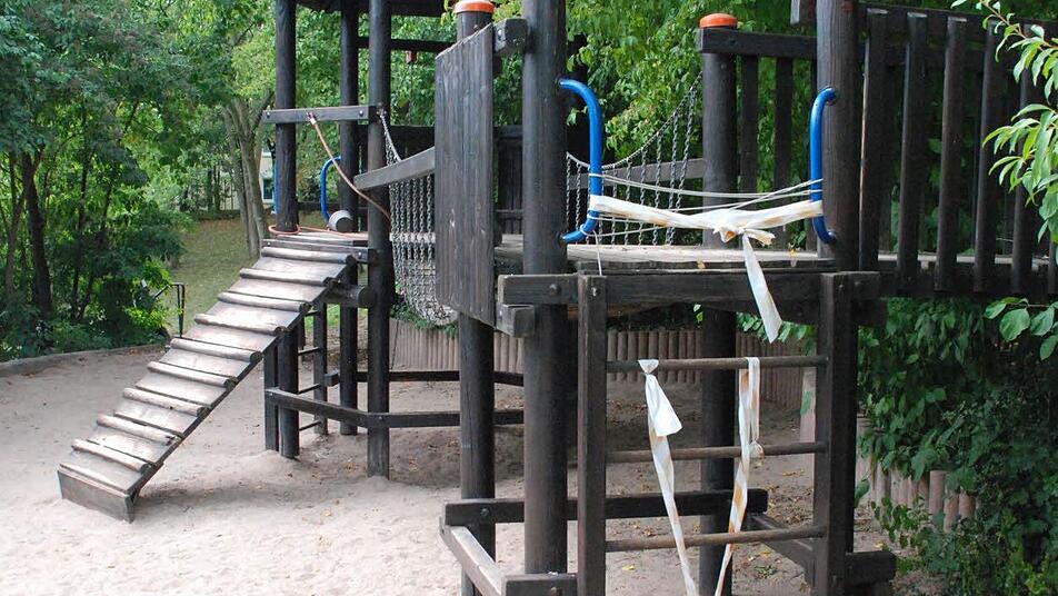 Trostlos wirkt der Außenbereich des evangelischen Kindergartens St. Lukas in Ketschendorf. Die Spielgeräte sind mit rot-weißen Bändern aus Sicherheitsgründen gesperrt. Das Betreten der Hängebrücke und des Häuschens ist zu gefährlich. Die grüne Hangrutsche darf auch nicht mehr benutzt werden, weil die Kinder sich die Kleidung daran aufgerissen haben. Die Bäume müssten gefällt werden, aber die Männer vom Grünflächenamt lassen auf sich warten. Ein Garteneinsatz seitens der Eltern sei deshalb Anfang des Jahres ausgefallen, berichten die Erzieherinnen.