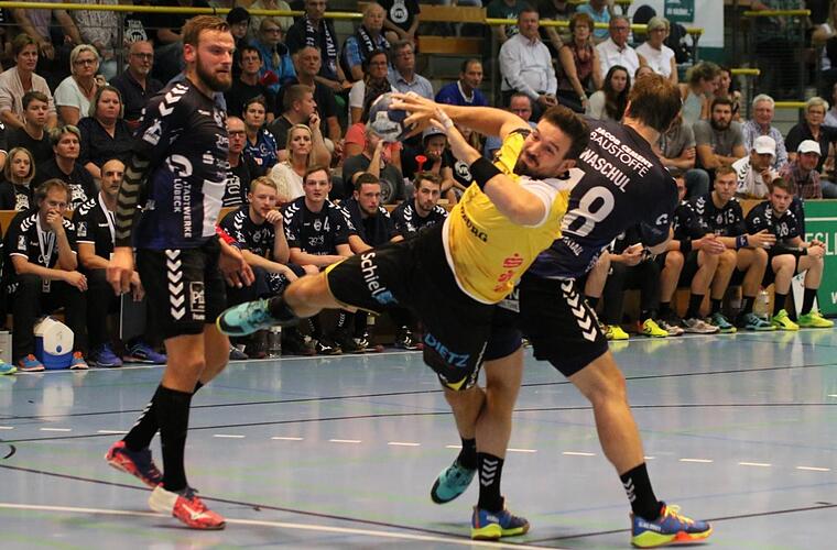 Auf der anderen Seite hatte Podpolinski viel Freiraum und wenig später viel Glück, als er Tobias Varvne bei einer Abwehraktion ins Gesicht traf und es nur eine Zeitstrafe gab. Mit elf Toren nach zwölf Minuten war es weniger ein Spiel der Abwehrreihen, auch wenn auf beiden Seiten hart zugepackt wurde. Den ersten leichten HSC-Ballverlust schlossen die Gastgeber mit dem ersten Konter des Spiel zum 9:6 ab, gingen wenig später erstmals mit vier Toren in Führung. Zu oft probierten die HSCler das Spiel über ihre Kreisläufer. Darauf hatte sich Lübeck eingestellt, massierte die Deckung im Zentrum, so dass dort kaum Platz war. Beide Teams brachten in Unterzahl den siebten Feldspieler. Auch Gorr, der so die Zeitstrafe von Philipp Barsties überbrückte.