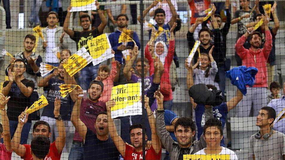 Kurz vor dem Anpfiff begrüßten HSC-Hallensprecher Thomas Apfel und 3. Bürgermeister Thomas Nowak die Asylbewerber, die der HSC in Zusammenarbeit mit dem Sportamt der Stadt Coburg zu dieser Pokalpartie eingeladen hatte.