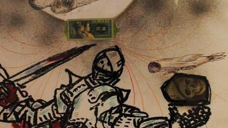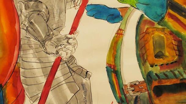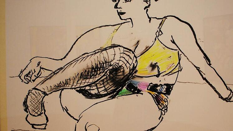 In der kolorierten Zeichenserie "Don" irren wahlweise der Rasende Roland des Ariosto oder Don Quijote herum. Der sieht sich einmal konfrontiert mit einem grünen Frankenstein. Die "Arbeiterin" genannte, kleine Ameise dazwischen blickt pikiert. Und ach, im Nebenraum finden Sie dann auch noch - in welchem Geiste, können Sie sich denken - die "Rosa Seide für Richard Wagner", Kaltnadelradierungen aus einer 2013 erstellten Kassette.