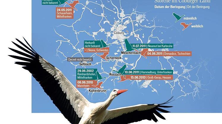 Schweden, Tschechen, Franken, Schwaben - sie sind ein internationales Völkchen, die Störche, die sich in diesem Jahr im Coburger Land niedergelassen haben. Das geht aus den Daten über die Tiere hervor, die zum großen Teil durch ihre Beringung am Bein zu identifizieren sind. Wobei der Tag der Beringung nicht ganz genau das Alter der Tiere markiert, erklärt Hans-Peter Schönecker, der Storchenbeauftragte der Coburger Kreisgruppe im Landesbund für Vogelschutz (LBV): "Die Beringung erfolgt durch geschulte Beringer im Zeitraum 15 bis 42 Tage nach dem Schlüpfen der jungen Weißstörche."