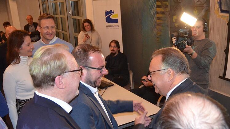 Diese begrüßen wenig später ihren Kandidaten begeistert. Es herrscht regelrechte Aufbruchstimmung bei den "Schwarzen". Fällt am Ende doch schon heute Abend die rote Festung Landratsamt, wird Sebastian Straubel der erste Landrat, der nicht der SPD angehört? Schon sickert durch, dass die Wahlbeteiligung gering ist - erschreckend gering. "Vielleicht wollen die alle auf die Stichwahl warten", meint Sebastian Straubel. Wenig später ist ihm selbst die Überraschung anzumerken, als es scheint, er könnte schon im ersten Anlauf siegen. Nach den ersten Landgemeinden liegt er über 50 Prozent. Dann holt Martin Stingl Neustadt, Christian Gunsenheimer (FW) punktet in Weitramsdorf. Schließlich ist klar: Sebastian Straubel und Martin Stingl gehen in die Stichwahl.