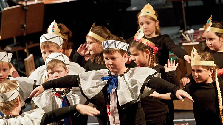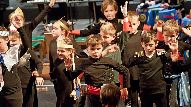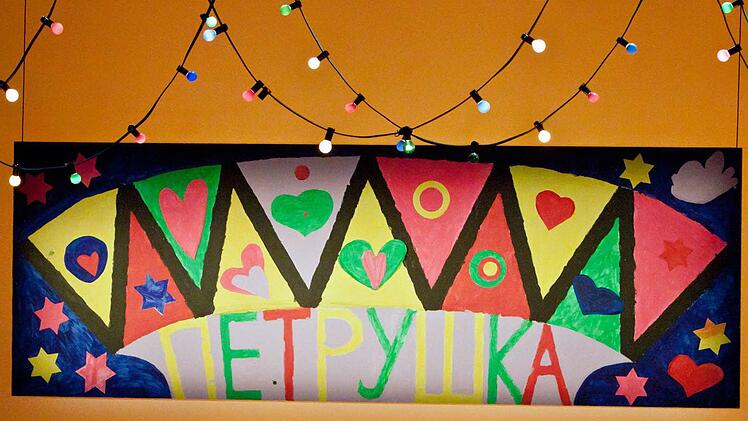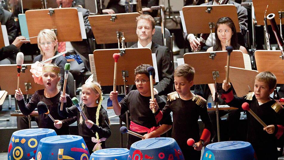 "Petruschka" steht in riesigen kyrillischen Buchstaben auf einem großen Plakat an der orangefarben leuchtenden Rückwand. Dann füllt sich die Bühne - mit Musikern des Philharmonischen Orchesters und mit vielen, vielen Schülern. Denn für einen ungewöhnlichen Konzertabend werden zwei dritte Klassen der Emil-Fischer-Grundschule Dörfles-Esbach ebenfalls zu Musikern. Auf Xylofonen und Glockenspielen, aber auch auf bunt dekorierten blauen Plastiktonnen und ausrangierten durchsichtigen Wasserkanistern werden sie ihre Version von Igor Strawinskys Ballettpartitur "Petruschka" musizieren.