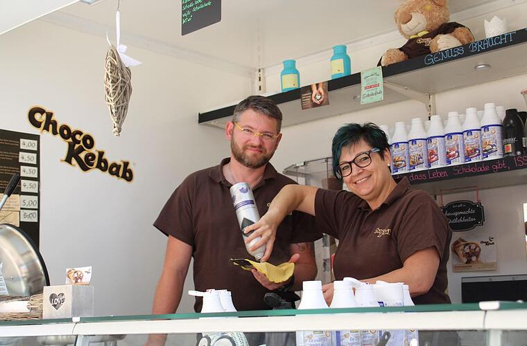 "Seit etwa einem Jahr sind wir auf Street Food Festivals mit unserem Choco Kebab Stand vertreten", erzählt Manuela Vogt. Letztes Wochenende waren sie und ihr Partner Christoph Kurkowski in Fulda, am kommenden Wochenende geht's nach Leipzig. "Besonders gut gefällt uns, dass diese Tätigkeit so abwechslungsreich ist. Als sie und ihr Partner vor über zwei Jahren in Augsburg auf einem Festival selbst zum ersten Mal einen Choco Kebab probierten, kam den beiden die Idee, auch in die Branche einzusteigen. "Unser Choco Kebab ist noch relativ unbekannt. Es macht Spaß, den Leuten unser Produkt zu präsentieren", sagt Manuela Vogt.