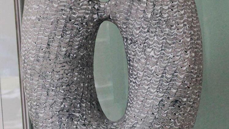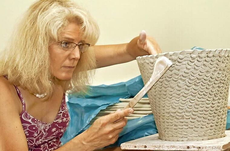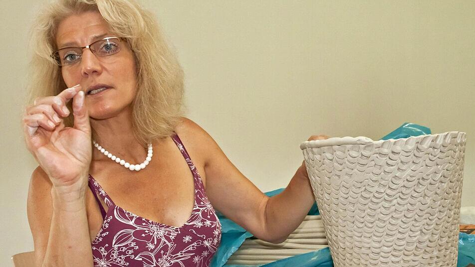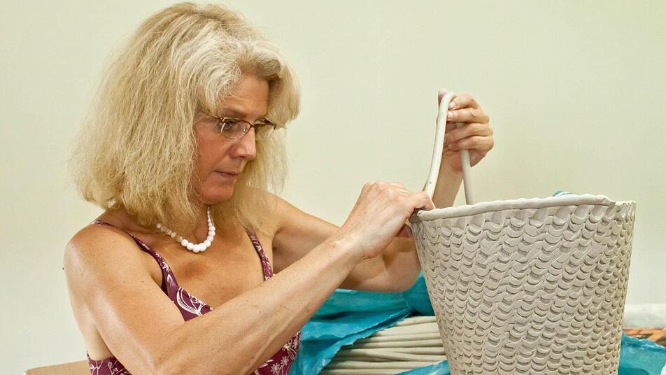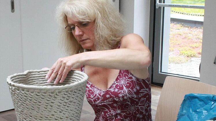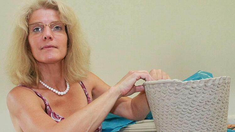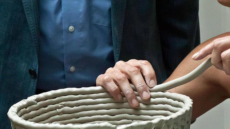 Keramiker müssen geduldige Menschen sein. Vor allem dann, wenn sie in jener Technik arbeiten, die Sigrun Wassermann bevorzugt. Ihre Spezialität: Gefäße, die wie gestrickt aussehen. Stück für Stück baut sie ihre Vasen aus Drehton auf. Diese etwa 20 Zentimeter langen, gut einen Zentimeter dicken Tonwürste legt sie Reihe auf Reihe übereinander. Mit der linken Hand hält sie die langsam wachsende Tonwand von innen fest, von außen klopft sie Stück für Stück mit einem seltsam geformten Holzlöffel dagegen. "Im Grunde ist das ein Flaschenknecht", erklärt die Keramikerin. Damit verleiht sie den Schichten aus Drehton fast das Aussehen von Flechtwerk.
