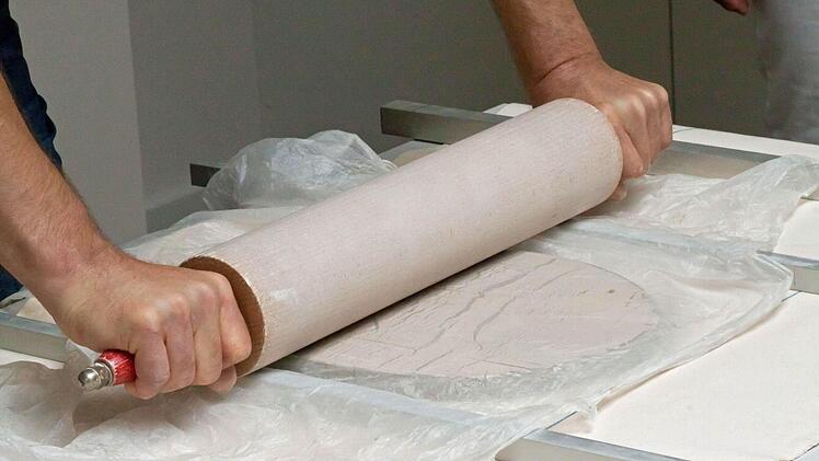 Mit Rundholz gewalzt Die Grundlage ist eine runde Tonscheibe, die er mit flüssigem Porzellan bestreicht. Ist das Porzellan angetrocknet, walzt er die Scheibe dann mit einem breiten Rundholz. Bei diesem Vorgang entstehen interessante Risse in der Oberfläche.