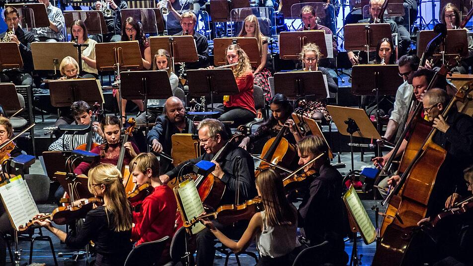 Wie junge Instrumentalisten beim Mitmachkonzert gemeinsam mit dem Philharmonischen Orchester unter Leitung von Dominik Tremel musizieren.