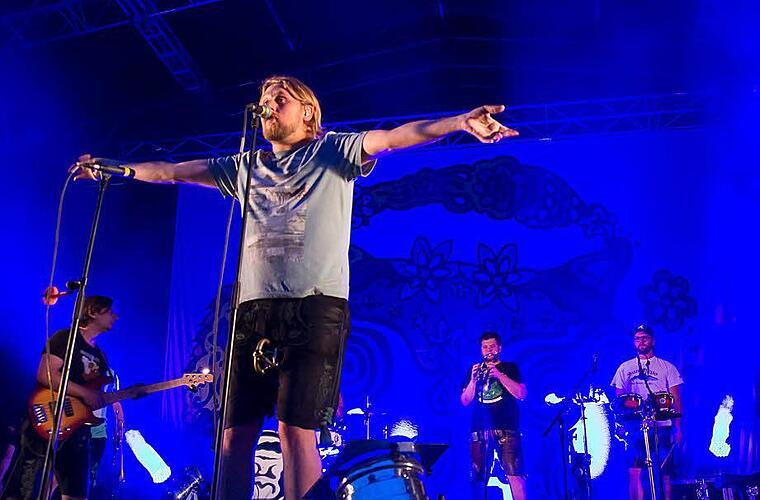 Nach ihrem gar nicht gesunden Hype mit dem European Song Contest haben sich LaBrass Banda - schon zum dritten Mal in Tambach, davor auch schon im Coburger Rosengarten - wieder auf ihren eigentlichen Anspruch (auch als studierte Musiker) besonnen. In der Lautstärke zurückgenommen, dafür bei allem Wahnsinnstempo wieder klar und sauber ausgeführt und überlegt komponiert, musikalisch eben sehr interessant in der ihnen eigenen verrückten Art - so jubeln La BrassBanda den begeisterten Massen Soul, Jazz oder traditionelle Volksmusik -Stücklein unter.