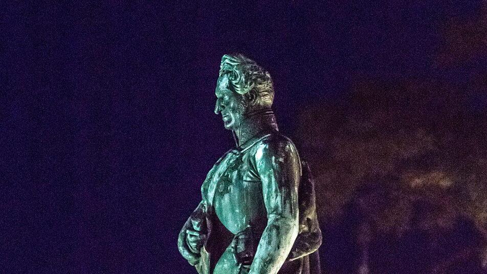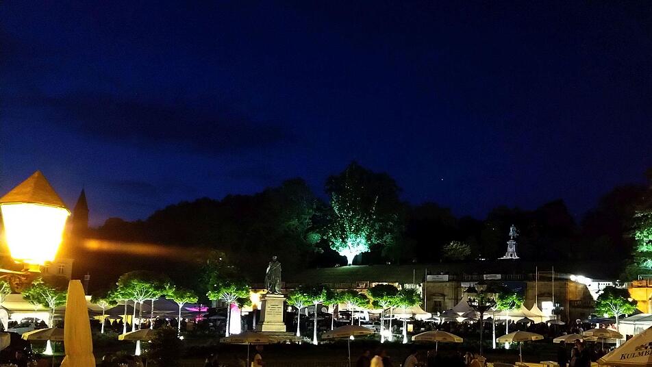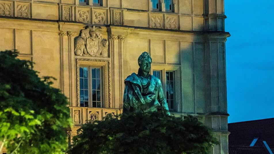 Ungerührt mittendrin im bunten Schlossplatz-Treiben: Ernst I. als stummes Denkmal auf hohem Sockel im Rondell. Und droben, an diesen festlichen Tagen effektvoll angestrahlt: das Reiterdenkmal von Ernst II. im nächtlichen Hofgarten.
