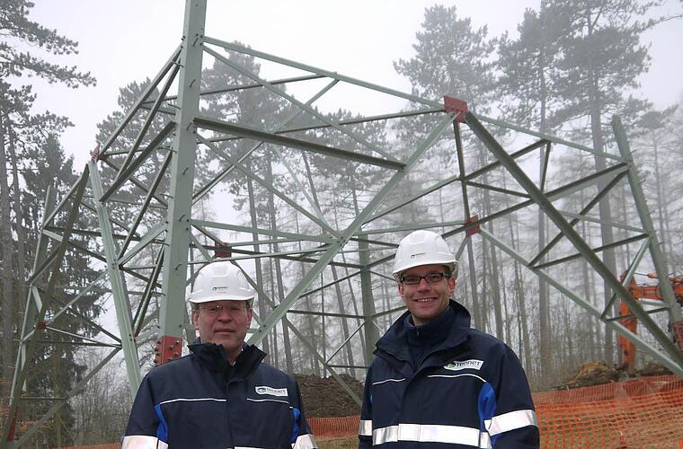 Treffpunkt Mast 114. Droben auf der "Hohen Schwenge" hat Tennet mit dem höchsten Bauwerk für die 380-Kilovolt-Höchstspannungsleitung durch das Coburger Land begonnen. Rund 80 Meter hoch wird der Mast, erklärt Markus Lieberknecht, der Pressesprecher des Netzbetreibers.