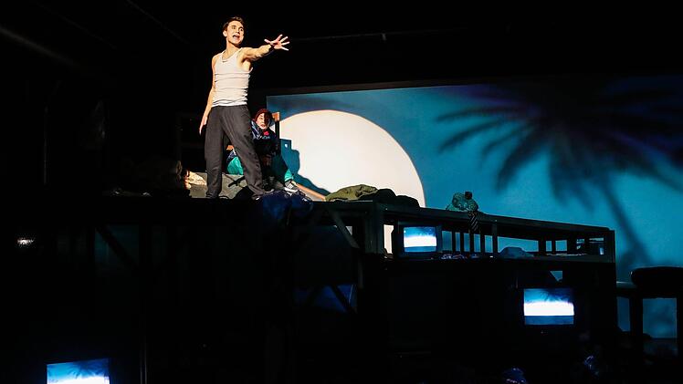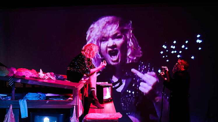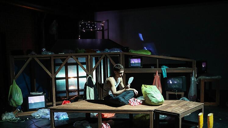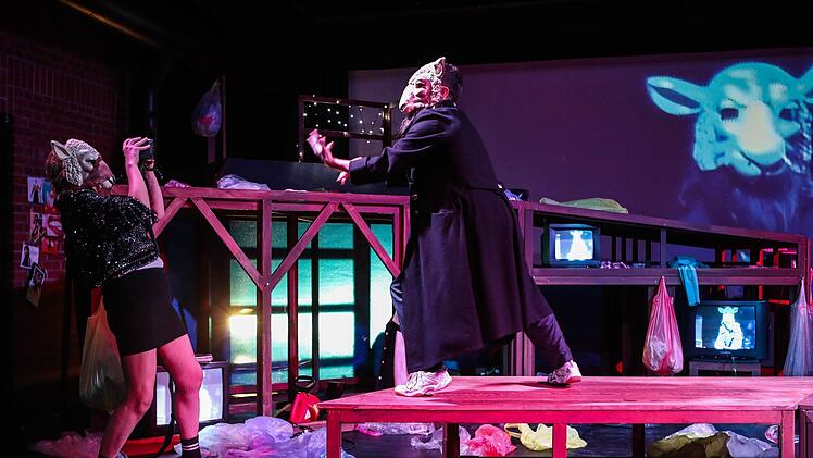 Diese Generation existiert ja nur noch in technischer Selbstreflektion. Also spielt eine kleine Handkamera hier die dritte Hauptrolle. Ständig wird gefilmt, oft in extremer Nähe, dann in Totale, und in Bildschirmgeräte übertragen, dazu aber auch in Großprojektion an die Rückwand der Reithalle.