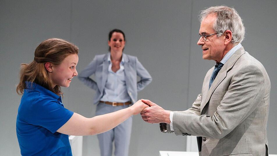 Und natürlich noch gefährdeter. Die Angehörigen, die "anderen" sind verblüfft, manchmal brechen alle gemeinsam in Gelächter aus. Was jetzt nichts beschönigen soll. Tochter Anne, von Eva Marianne Berger sehr einnehmend gezeigt, die mit dem Mut der Verzweiflung auch das zunehmend Bösartige ihres Vaters unbedingt aushalten will, gerät selbst an die Grenzen ihrer Identität und Kraft. Ihr Lebensgefährte Pierre (Thomas Kaschel) will gut bleiben in der unerträglichen Lage, kann sich aus seiner bestehenden Distanz aber früher wehren. Die Betreuerin Laura (Solvejg Schomers) will sich auf das Verrückte, das Verhalten, das unsere schützenden Gewohnheiten hinter sich gelassen hat, einlassen, wird aber ebenfalls schnell an die Grenzen des persönlich Erträglichen geschleudert. Kerstin Hänel und Benjamin Hübner tauchen in weiteren Rollen auf, in von André tückisch erinnerten oder verwechselten Gestalten.