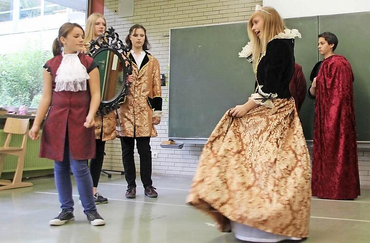 Für die nächste Szene betreten der Kriegsminister, in Rüstung, der Kanzler, in edlem Gewand, einige Diener und die Kaiserin, in prachtvollem Kleid, die Probenbühne. "Nun gut, wenn alle hier so begeistert sind von der Robe, dann wollen wir gehen und sie unserem Volk zeigen", sagt die Kaiserin. Was es mit dieser speziellen Robe auf sich hat, wird erst bei den Aufführungen enthüllt.