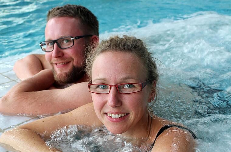 Sie sind mutig, die Neuen. Stine Michel und Tim Hübner haben sich als neues Duo an der Spitze der Betriebsleitung der "Therme Natur" sogar dazu überreden lassen, für ein Foto auf einem Flyer zu posieren. Offensiv auf die Gäste zuzugehen und persönliches Engagement zu zeigen - das ist momentan der Bereich, in dem die neue Betriebsleitung des einziges Thermalbades im Coburger Land direkte Ergebnisse erzielen kann. Denn bis technische oder gar bauliche Veränderungen in der Therme in Angriff genommen werden, wird es noch ein bisschen dauern.