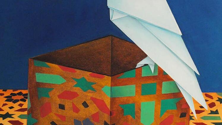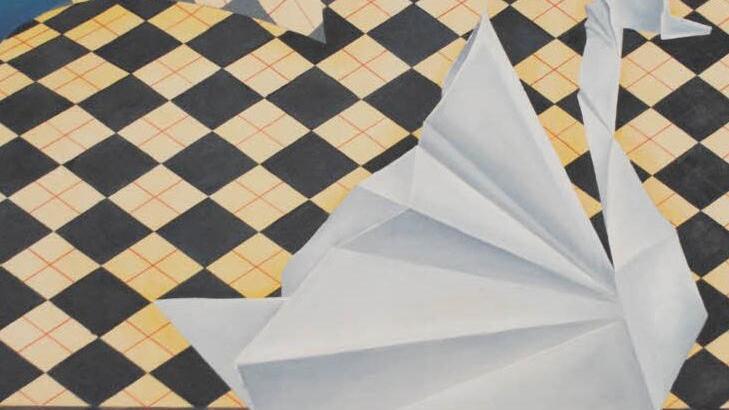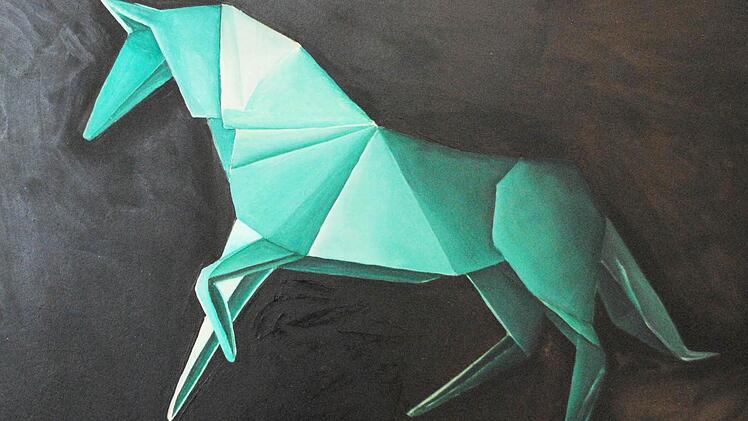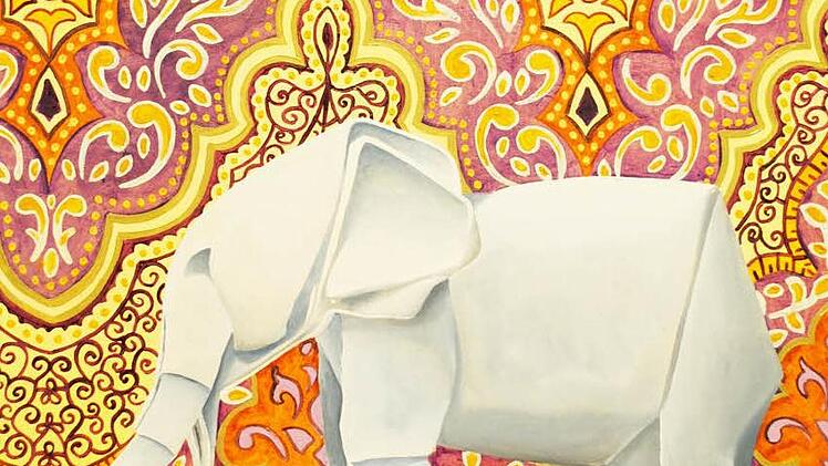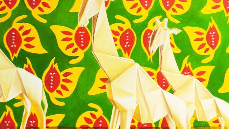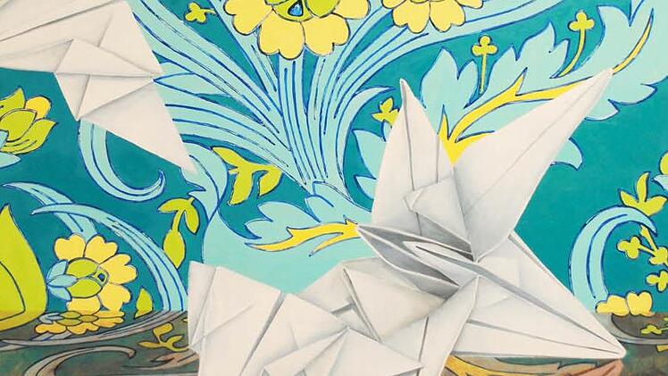 Riccarda Pickert hat ihre Tiere erst als kleine Origami-Kunstwerke nachgebildet, die an sich schon verblüffen in den effektvollen Faltungen. Sie wurden auf Spiegel gesetzt, um sich kopfüber oder seitlich zu verdoppeln. Dann porträtierte Riccarda Pickert ihre ungewöhnlichen Modelle in Öl auf Papier plastisch und eindringlich, vor an sich schon wunderschönen Tapeten aus Blumen, Mustern, Ornamenten. - Wie merkwürdig, wie reizvoll, wie raffiniert.