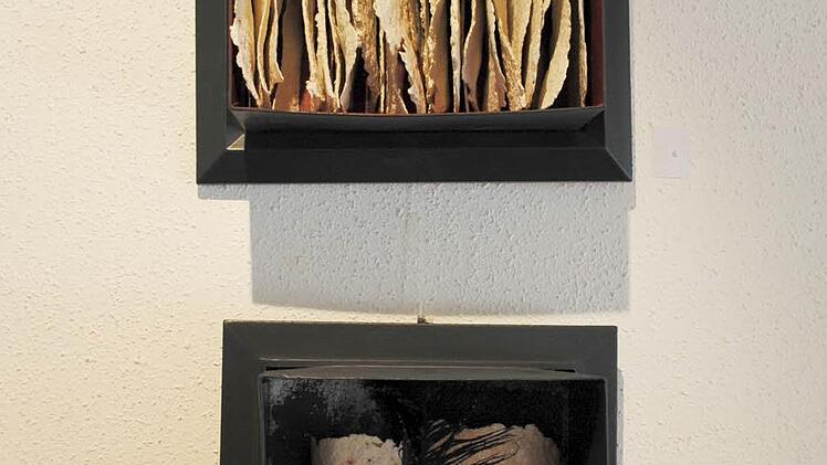 Im Teehaus sind holzgerahmte Kästchen von Michaela Rothe - heutzutage selbstverständlich "Boxes" genannt - arrangiert, alles scheint übersichtlich geordnet. Doch in ihnen stecken, vor farblich in weitere Tiefgründe führend, Rollen aus grobem, wie aufgeweichtem Papier. Auf manchen sind noch Schriftzeichen zu erkennen.