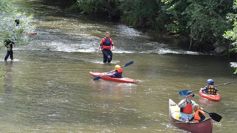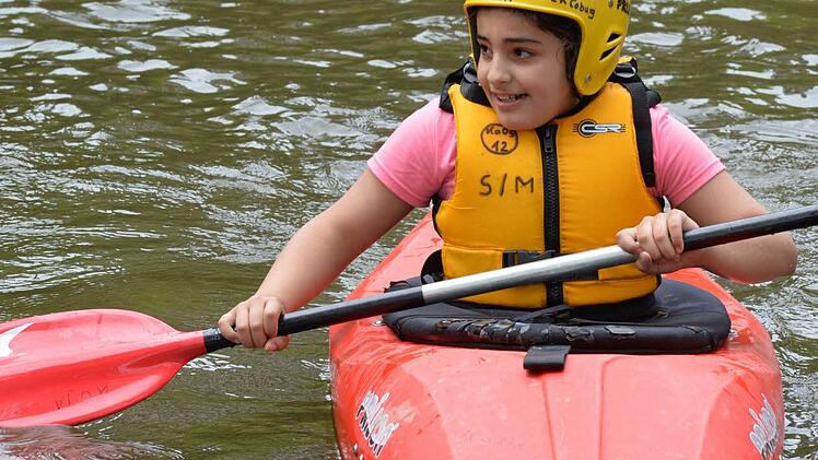 Gleichgewichtssinn war dagegen auf dem Riesen-Ball-Parcours direkt daneben gefragt. Sebastian steht jetzt beim Paddeln an. Erstmals konnten die Kinder die Itz befahren.