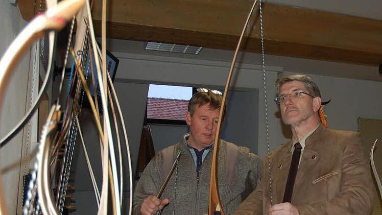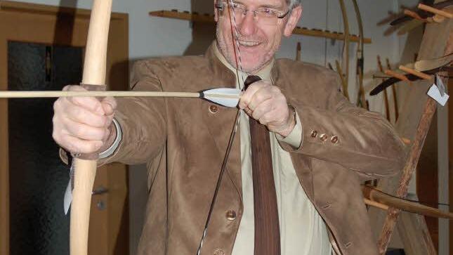 "Ich glaube ich werde demnächst mal hier einkaufen", sagt er entschlossen und spannt einen leichten Bogen aus Ratanholz. "Der wiegt fast nichts", ist der Landrat begeistert. "Der hat aber auch nur 20 Pfund", sagt Beier und meint die Kraft, die nötig ist, um den Pfeil ganz auszuziehen. Er gibt Busch einen Bogen mit 45 Pfund. "Oh, das ist schon etwas anderes..."