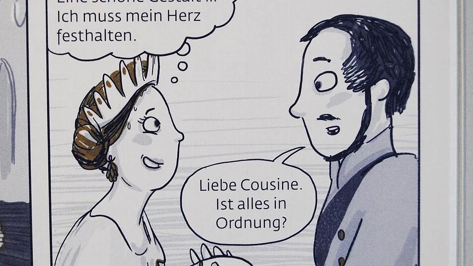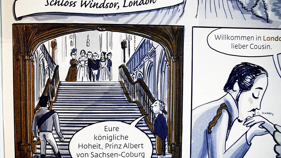 In dieser Darstellung der Geschichte der Ernestiner geht es dann ratzfatz zur bedeutendsten Eheschließung des Herzogshauses Coburg, Sachsen und Gotha im 19. Jahrhundert, des wichtigsten politischen Instrumentariums der Ernestiner. Wir befinden uns schließlich im Comic. Den hat ein einfallsreiches Redaktionsteam zur großen Thüringer Landesausstellung in diesem Jahr verfasst.