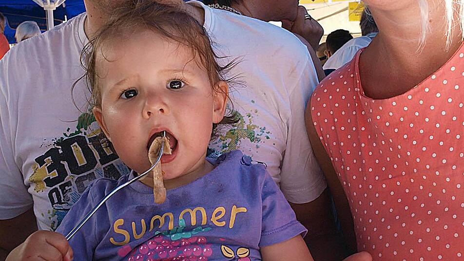 Emilie zählt stolze 16 Monate Lebensalter. Aber die typisch-fränkische Lebensart am Fuß der Fränkischen Krone hat die junge Dame schon verinnerlicht: Auf dem Coburger Klößmarkt und dem Schoß von Papa Stefan lässt sich Klein Emilie einen Rutscher mit Soß' schmecken.