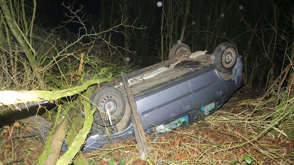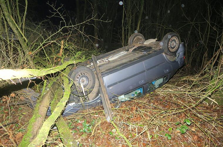 Im Kurvenbereich fuhr er geradeaus über die dortige Grünfläche und "tauchte“ mit hoher Geschwindigkeit in das angrenzende Waldstück ein. Hierdurch überschlug sich das Auto, wodurch mehrere dünnere Bäume gefällt wurden.