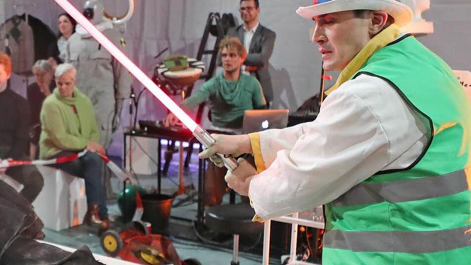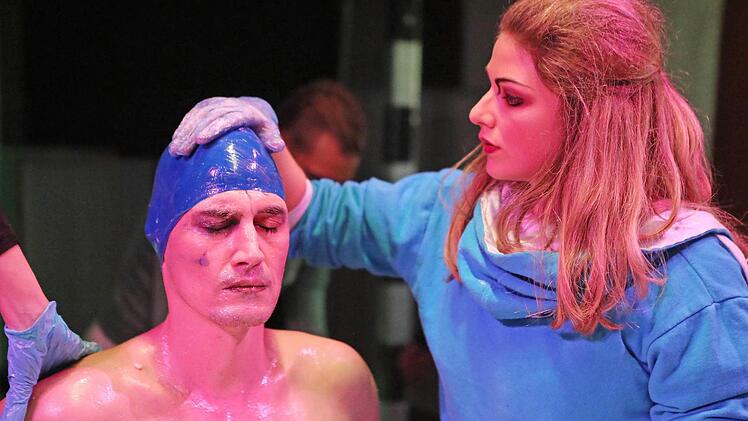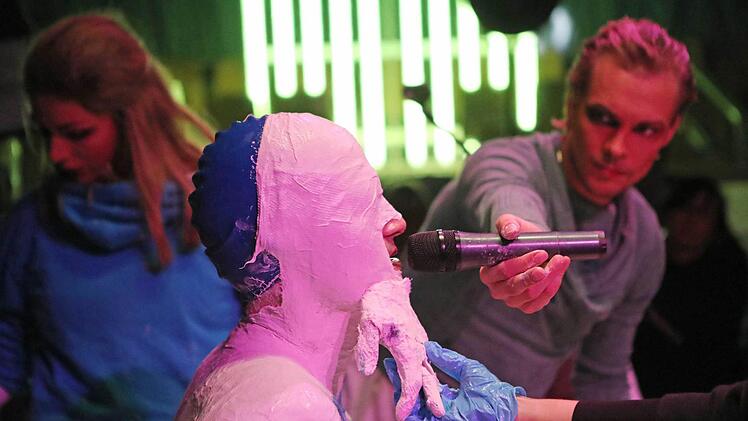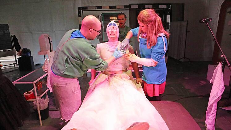 Zugelassen sind ohnehin nur 60, mehr passen nicht zwischen den Seziertisch mit erschreckenden Menschenresten aus Pappmaché, zwischen Maschinen, Kompressor, kalten Lichtern, Körpertestvorrichtungen und Synthesizer. Von dem aus steuert Oliver Baesler den einnehmenden Klangraum, denn folgerichtig werden Jelineks Texte auch zu klanglichen Mustern in klangatmosphärischen Räumen, vom quersprecherischen Durcheinander in chorische Wucht.