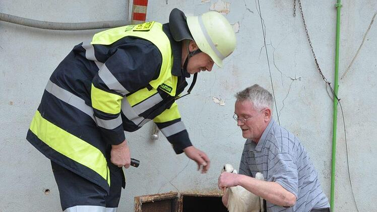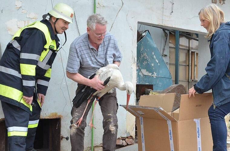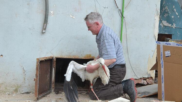 Dann entdeckt Hartung eine Klappe, die ein Reinigungsschacht zum Sockel des Schlotes sein könnte. Ein Tritt mit dem schweren Feuerwehrstiefel und der Zugang ist frei. Joachim Lessing öffnet die Luke und traut seinen Augen nicht: "Da sind ja zwei drin", staunt er. Und noch etwas fällt ihm beim ersten Blick schon auf. Es ist der Ring am Bein des einen Tieres. "OX 435" liest er da. Damit ist klar, dieser Storch ist das männliche Tier genau des Paares, das auf Lessings eigenem Dach in Scherneck brütet. Der Tierarzt hat zunächst keine Zeit darüber nachzudenken. Erst gilt es, die Tiere aus ihrem Verlies zu befreien. Als er den ersten Vogel zu fassen bekommt und an Tageslicht holt, stellt er schon fest, dass es ein Weibchen aus Schweden ist. Welches Tier das ist, wird er erst später erkennen. Dann kommt der männliche Storch heraus und muss ebenfalls erst einmal in den Karton.