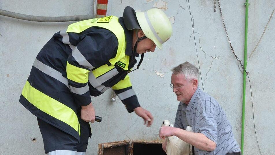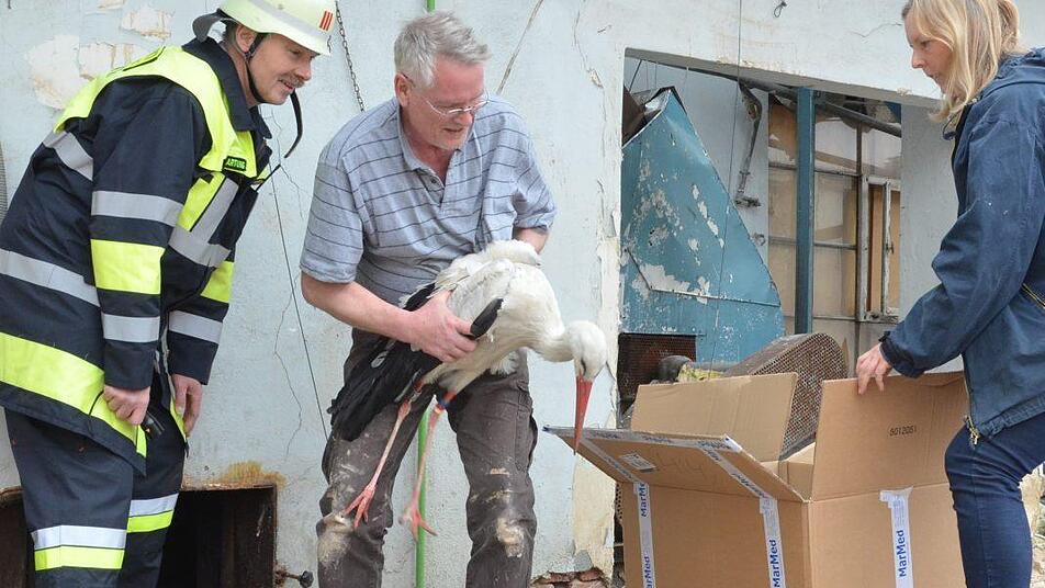 Eine Storchendame stürzt in einen Industrieschlot - und trifft dort auf ihren Ex-Partner. Dank einer aufmerksamen Tierfreundin werden beide gerettet.