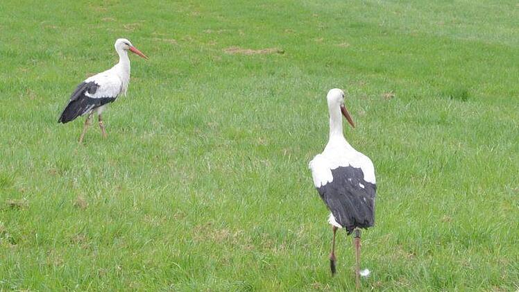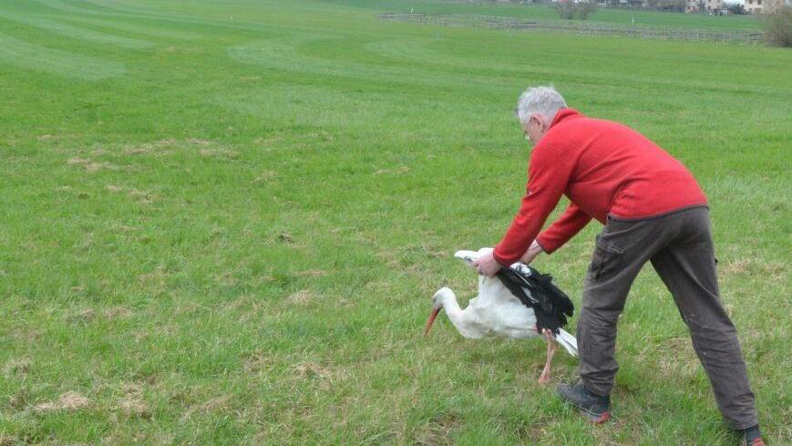 Minuten später ist die Fracht nach Scherneck transportiert. Vorsichtig nimmt Joachim Lessing den ersten Storch aus der Box. Es ist das Weibchen. Etwas benommen stakst sie in die Wiese davon. Dann kommt das zweite Tier heraus. Es ist stark abgemagert, macht sich aber auch gleich in die Wiese davon. Anders als der erste Vogel hat dieser nur ein Interesse: Fressen. Er pickt eifrig auf, was ihm vor den Schnabel kommt.