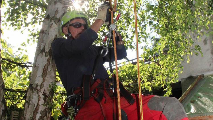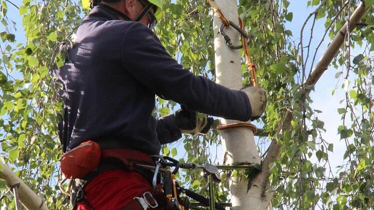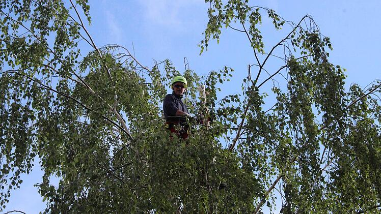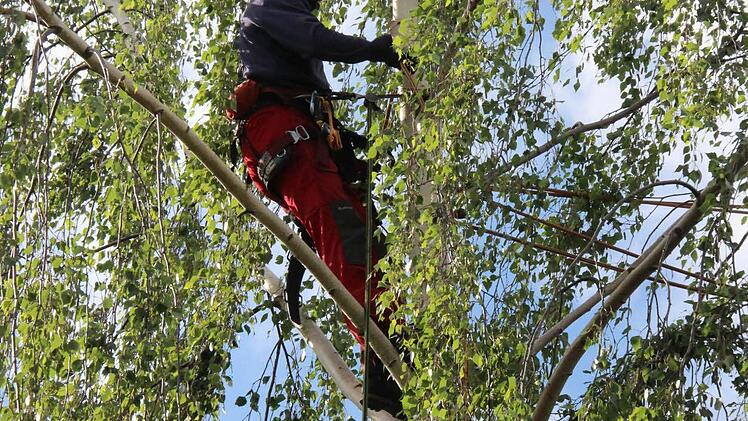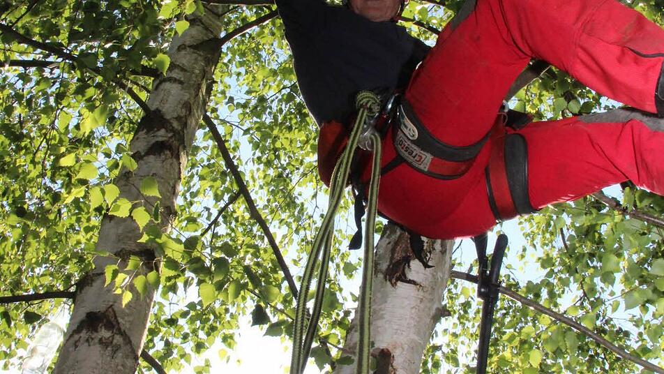 Die Blätter und Äste der rund 15 Meter hohen und zweistämmigen Birke rascheln und biegen sich im Wind leicht zur Seite. Ein Seil hängt vom Baum auf den Boden. Bei genauerem Hinsehen ist zwischen dem satten Grün etwas Rotes zu sehen. Mit neongelbem Helm hängt Uwe Nawrath im Wipfel der Birke und sägt einen der oberen Äste ab.