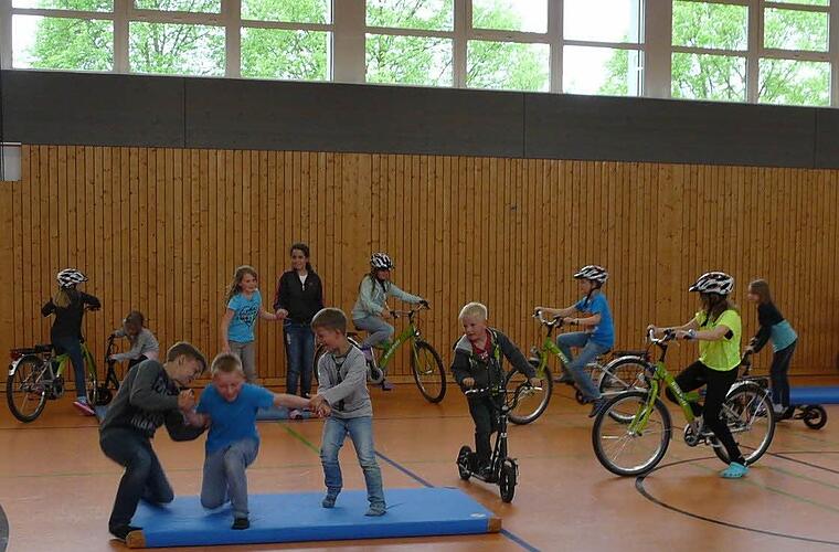 Die Motorik der Kinder wurde beim Radfahren getestet, wobei Fußgänger einzeln und in Gruppen zu berücksichtigen waren. Das Schauen links, rechts, nach vorn und hinten gehörte zu den Übungen. Natürlich bestand bei diesem Test Helmpflicht. Auch dazu war ein weiterer Film zu sehen. Das Tragen eines Helmes kann Leben retten, wurde den Kindern plausibel gemacht. Schließlich mussten die Schüler ihr Reaktions- und Wahrnehmungsvermögen in Verkehrssituationen beweisen.