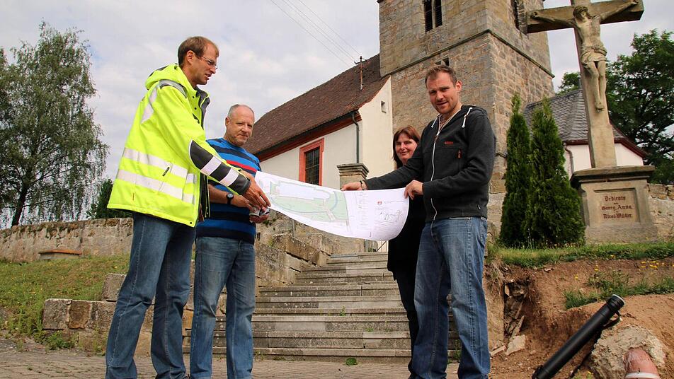 Völlig neu gestaltet werden muss das Umfeld der Kirche. Die marode Treppe, so erläutert Ullwer, solle zur Straße hin gedreht und erneuert werden.  Um einen barrierefreieren Zugang zur Kirche zur ermöglichen, wird der Gehweg neu gestaltet. "Das war den Leuten vor Ort sehr wichtig", berichtet der Vorsitzende des Vorstandes der Teilnehmergemeinschaft.