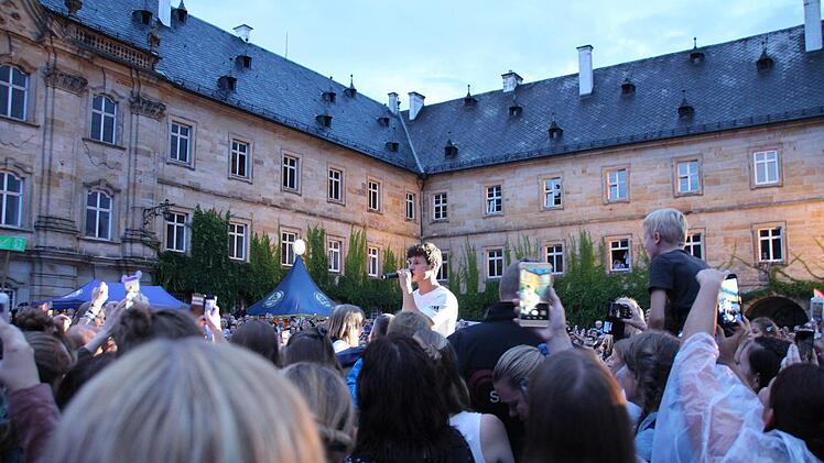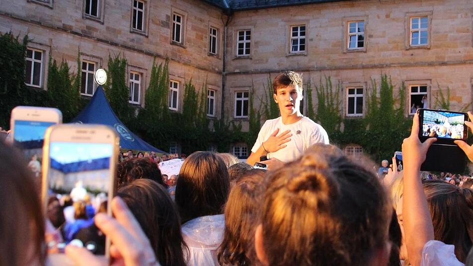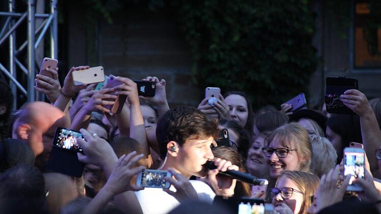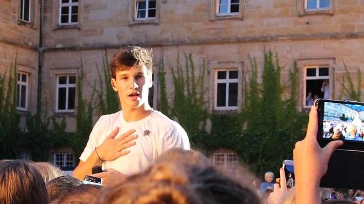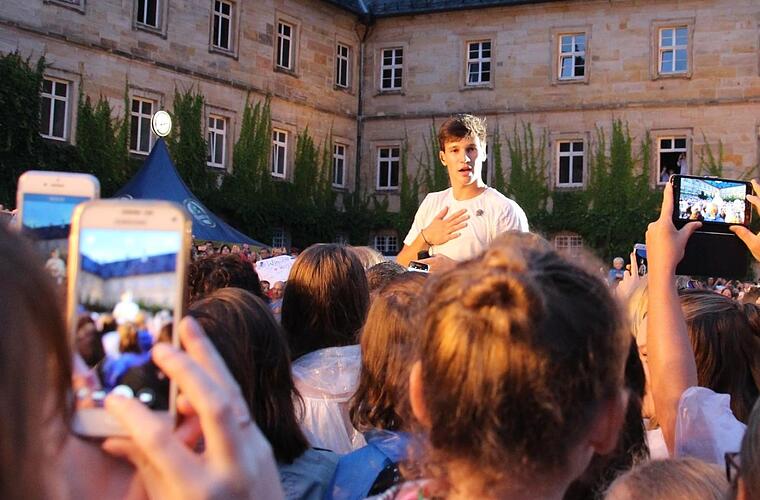 Welche Massen? 2500 im ausverkauften Schlosshof, die Mehrzahl davon Kinder und sehr junge Jugendliche, verzückte Mädels. Schon früh kuschelte sich alles zusammen zum großen heimeligen Ganzen, die Arme und Ärmchen winkend im Rhythmus, Tausende von Handy-Lämpchen funkelten im Schlosshof wie die Sternchen. Was für ein Anblick. Immerhin hatte Wincent Weiss mittlerweile seine Fans dazu gebracht, ihn direkt wahrzunehmen statt vermittelt durch die Handykamera, diese kaum zu überschätzende virtuelle Entrückungsmaschine.