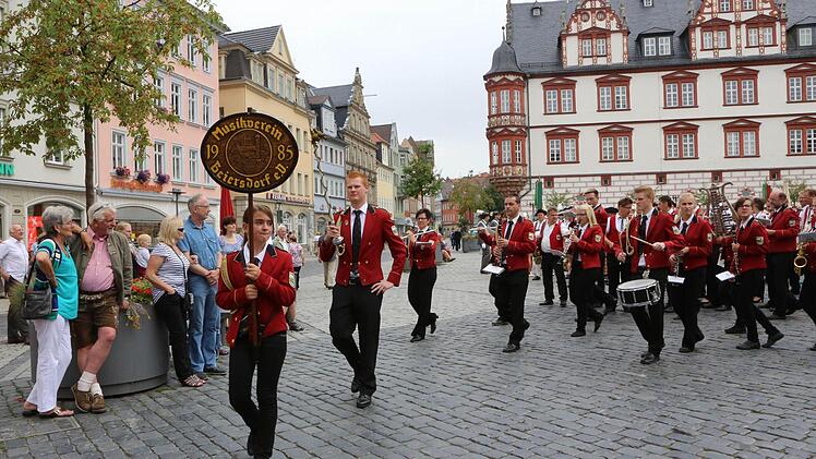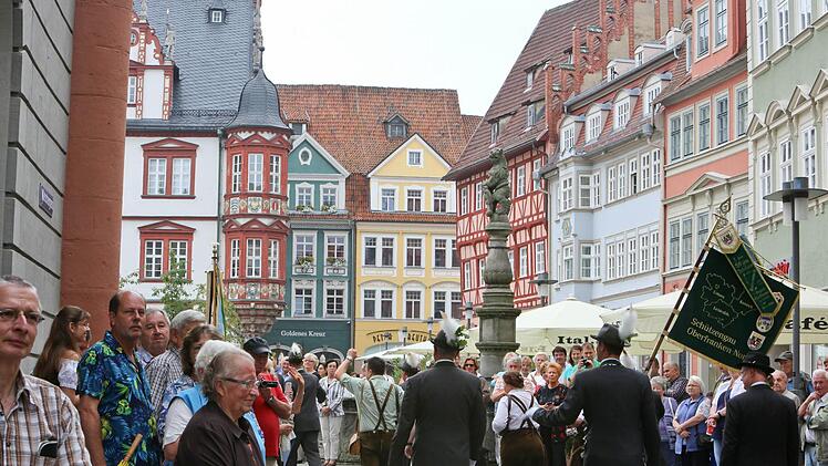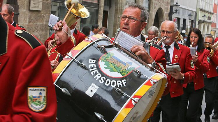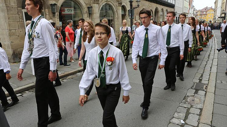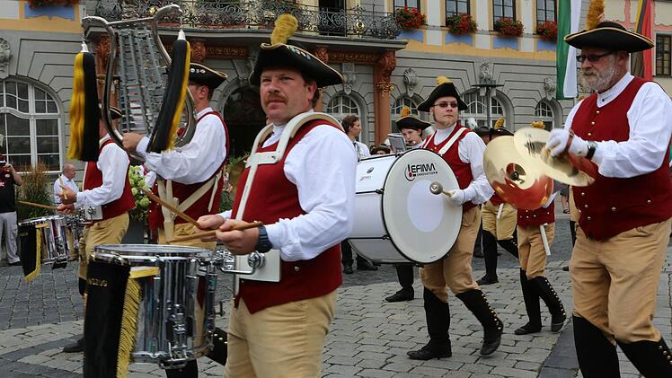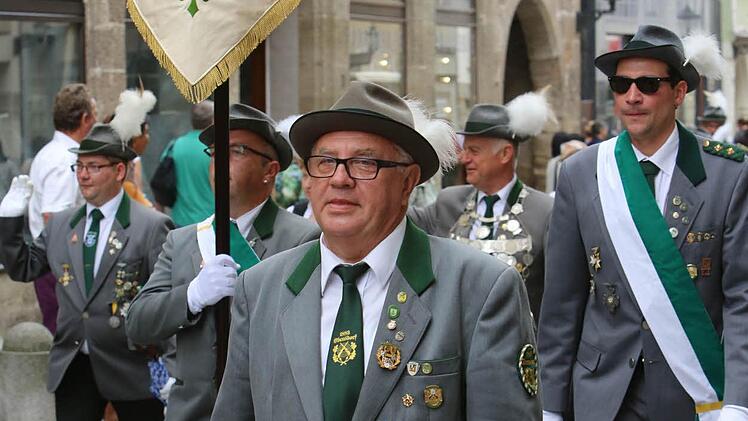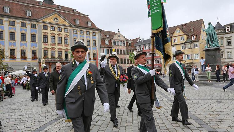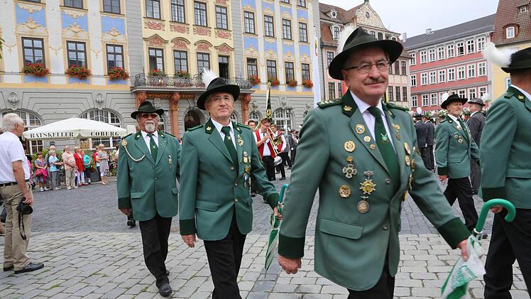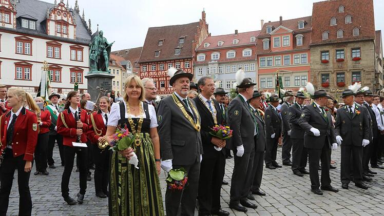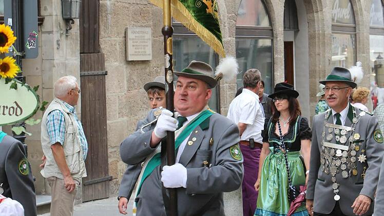 Dort musste sich die Abordnung der Königlich-privilegierten Schützengesellschaft Lichtenfels schon sehr vorsehen, dass die Anzüge und Dirndl nicht nass wurden. Denn die Gruppen von 14 Schützenvereinen und die Kapellen nahmen fast den halben Marktplatz ein.