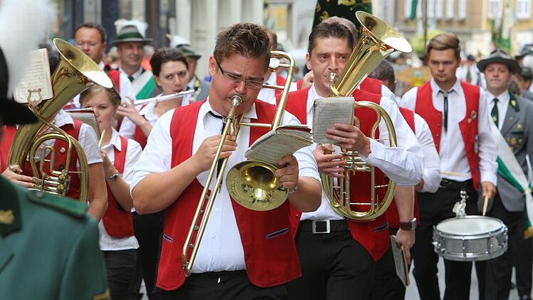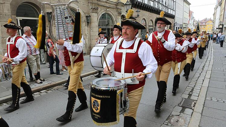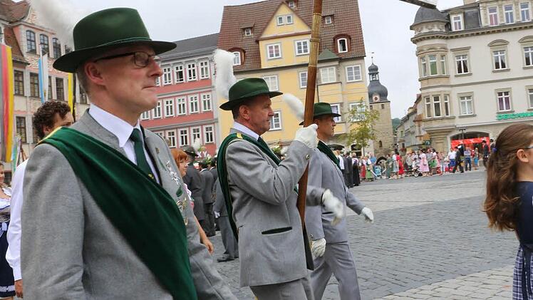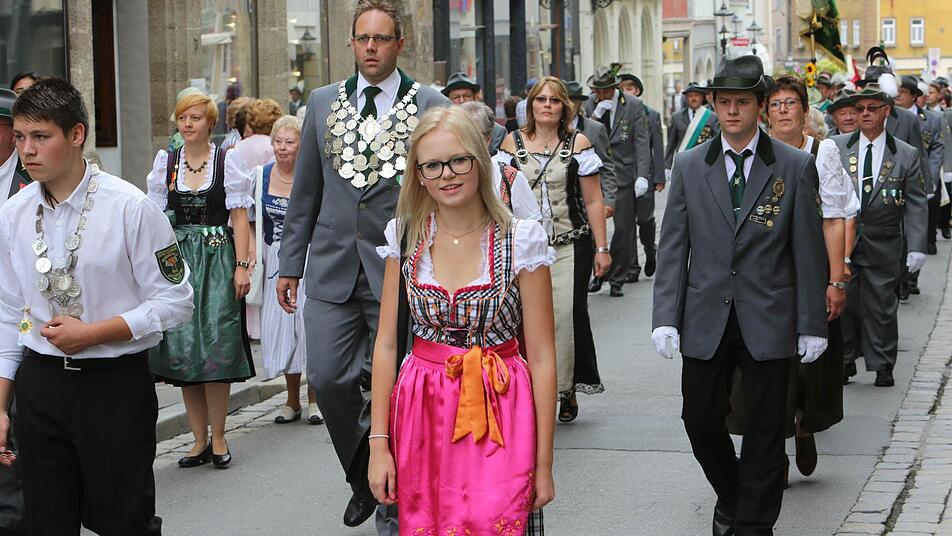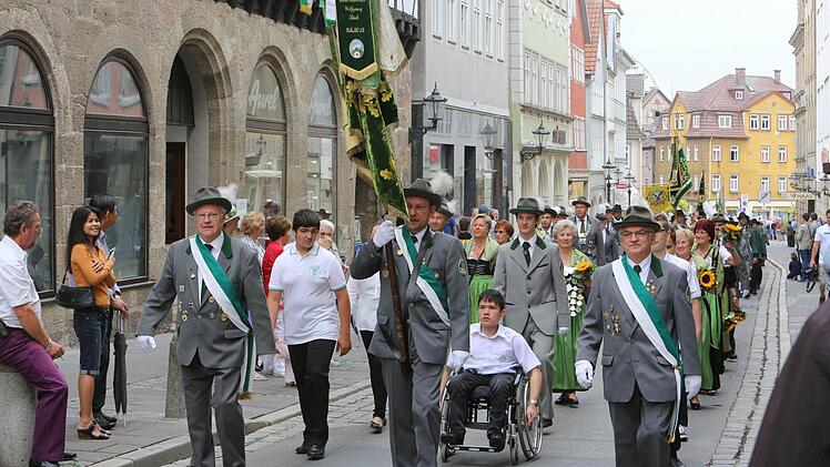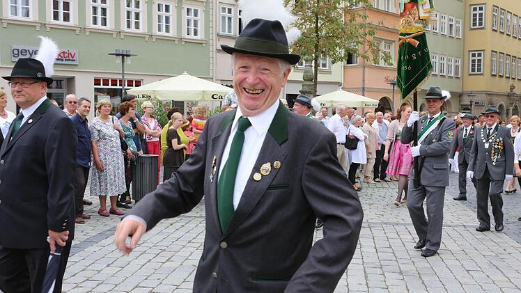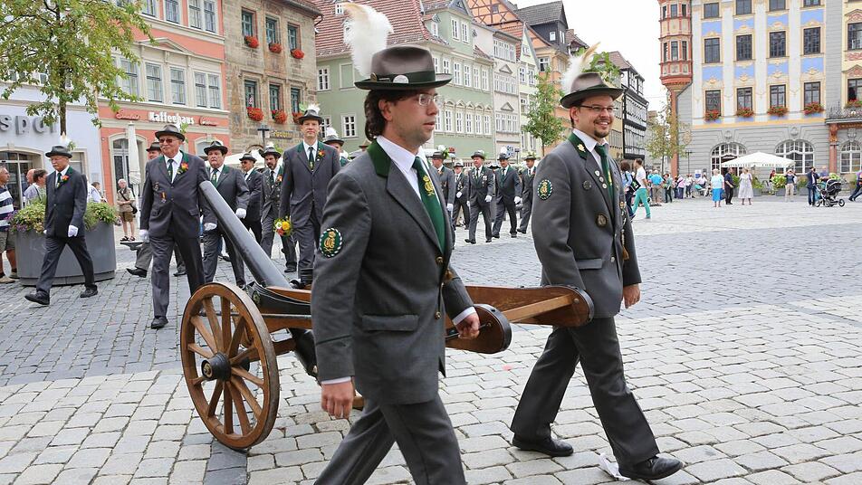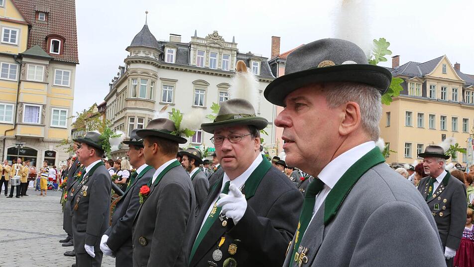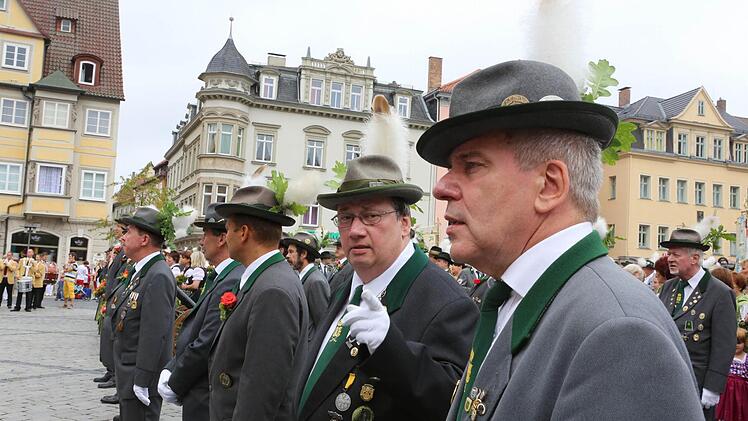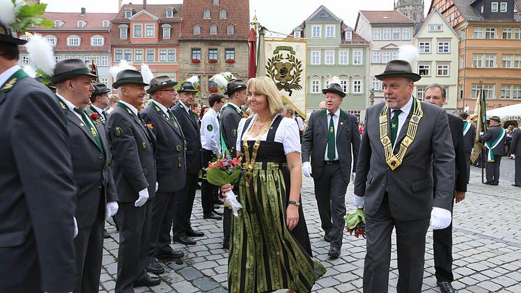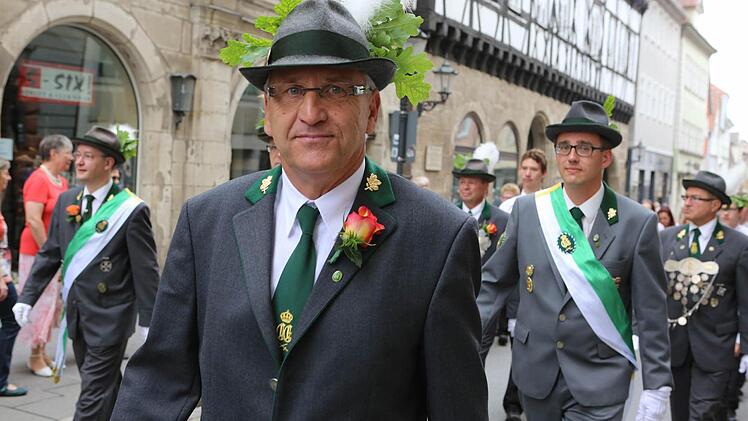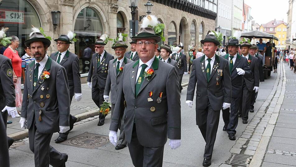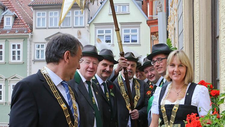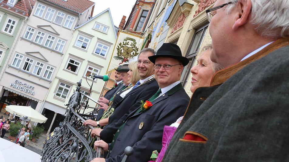 Alljährlich bringen die Schützen ihre Traditionsfahne von 1715 mit einem Festzug vom Rathaus zum Vogelschießen am Anger gebracht. Die Ansprache zum Schützenauszug gelang Oberbürgermeister Norbert Tessmer nach eigener Aussage jedenfalls besser als der Bieranstich zwei Tage zuvor.
