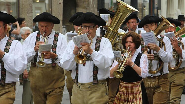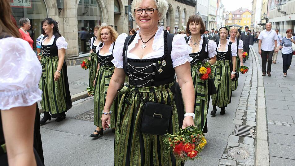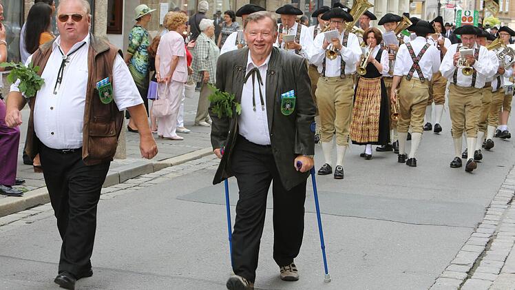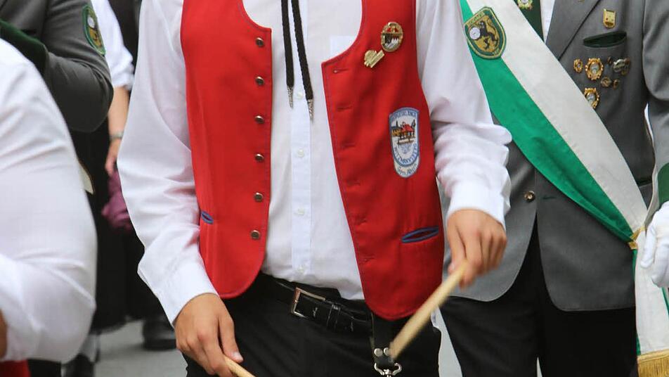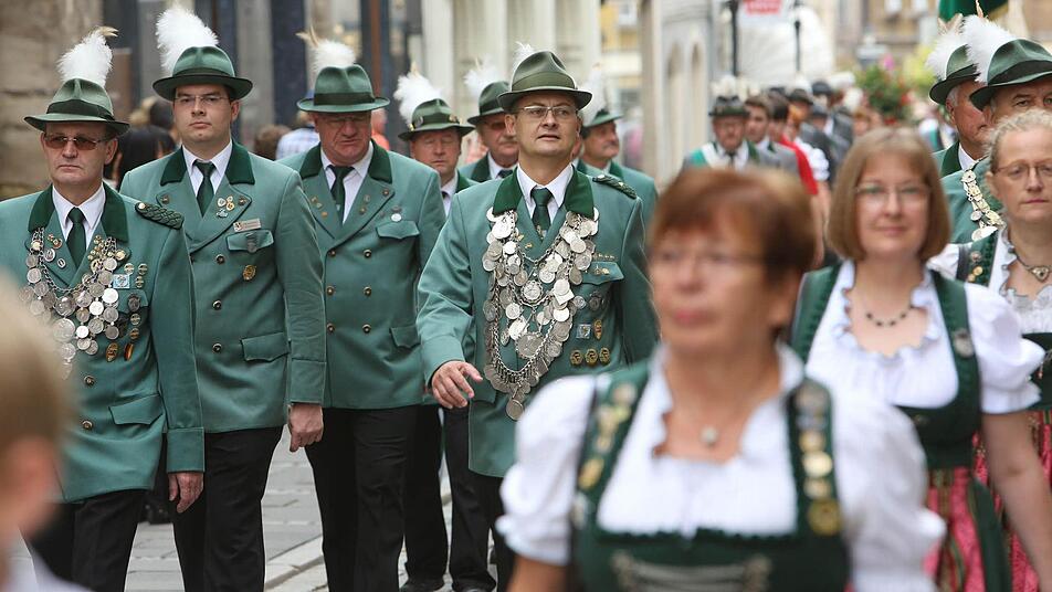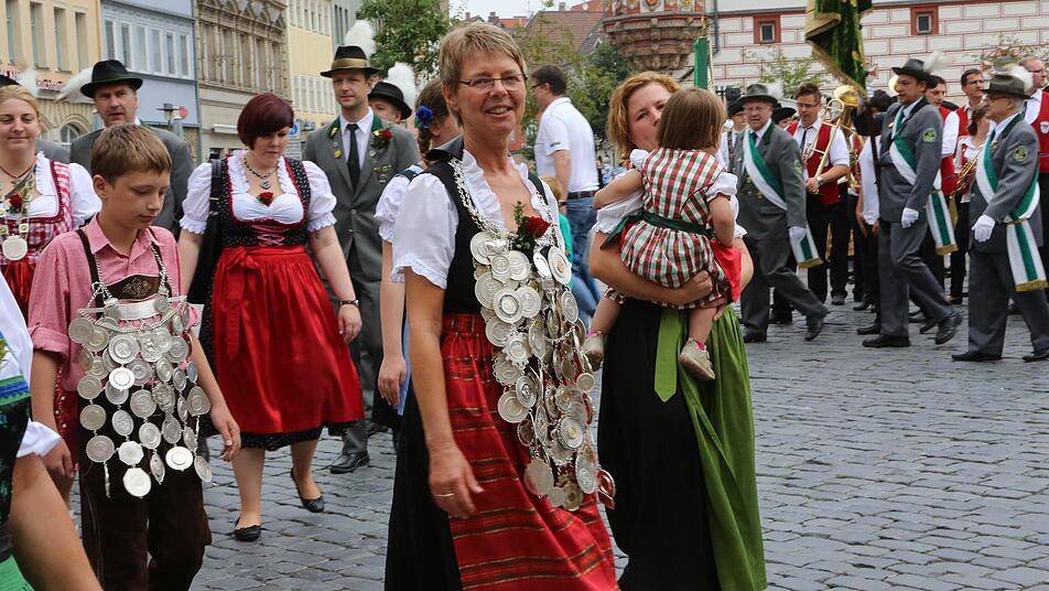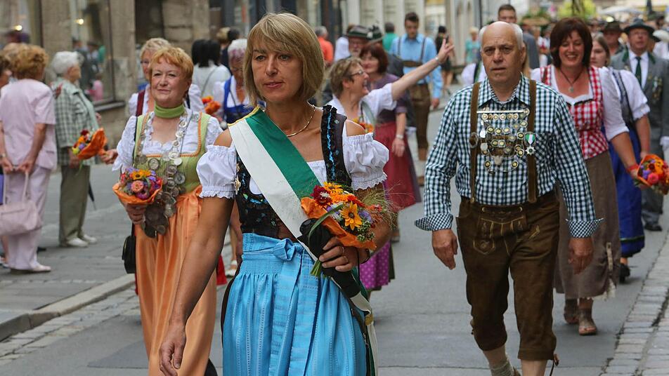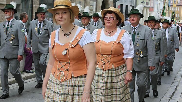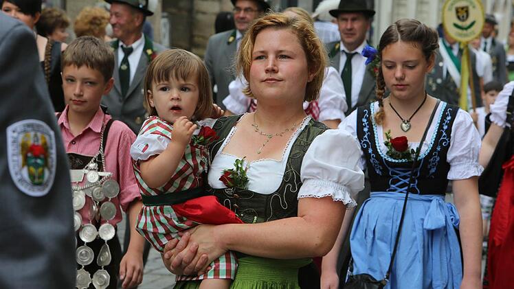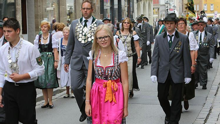 Wenn die Schützen ihre Fahne auf den Anger bringen, begleiten die drei Bürgermeister mit Amtsketten angetan den Zug. Tessmer und Zweite Bürgermeisterin Birgit Weber (CSU) gehören der SG an - Tessmer ging folglich im Schützenanzug, Birgit Weber trug zum schwarzen Dirndl die neue Schürze der Schützendamentracht. Das Dirndl mit Kettenschnürung trug sie nicht - sonst hätten sich womöglich die Amts- und die Zierkette ineinander verhedert.