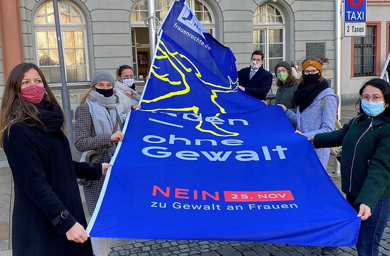 Um auch in diesem Jahr auf dieses wichtige Thema aufmerksam zu machen, haben sich das Team des Frauennotrufes und des Frauenhauses Coburg besondere Aktionen überlegt. Zum einen weisen Banner an den Stellwänden der Stadtein- und ausgänge auf dieses besondere Datum hin, zum anderen gibt es eine Statement-Aktion in den sozialen Medien. Außerdem beteiligten sich die beiden Einrichtungen des Vereins "Keine Gewalt gegen Frauen" an der bundesweiten Fahnenaktion von "Terre des Femme". Offene Türen rannten die Veranstalterinnen bei den zuständigen Personen in der Stadt Coburg mit der Bitte um Unterstützung ein. So hisste der Oberbürgermeister am Montag die Flagge zum Internationalen Tag vor dem Rathaus. Ihre Botschaft "Frei Leben ohne Gewalt" weht über den Coburger Marktplatz.