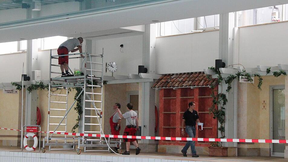 Aus dem Piratenschiff ragt der Kopf von Reinier Boeije heraus. Der Niederländer arbeitet für die Firma "Auqa Drolics" aus der Nähe von Eindhoven und setzt das Boot wieder instand. Auf einem Gerüst am Beckenrand steht Günter Geis von der Neustadter Elektro-Firma Radio Müller. Er verlegt mit seinen Kollegen lange LED-Lichtschläuche, die unterhalb der Folienspanndecke verlegt werden sollen. Die wurde vor kurzem erneuert, weil sie "in die Jahre gekommen ist", so Höhn. Dafür stand im leeren Becken auf der Fläche von 435 Quadratmetern ein riesiges Gerüst.