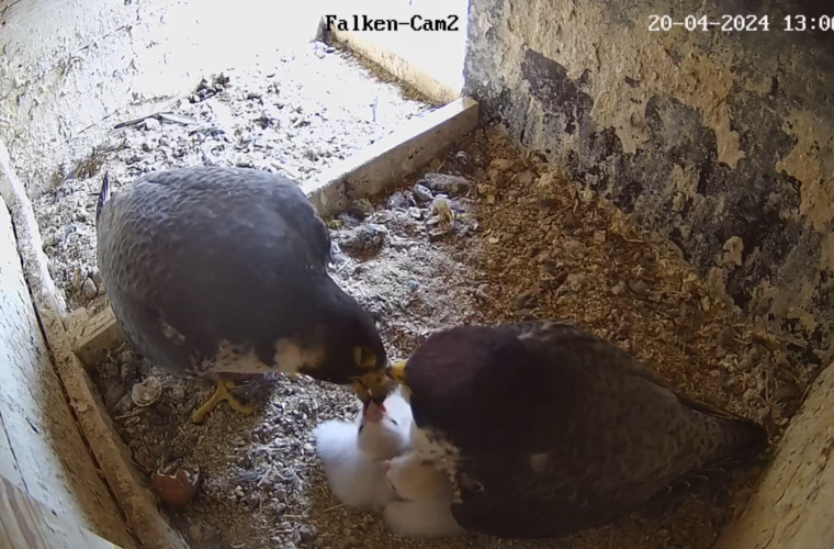 Zwischen dem 6. und dem 13. März legte das Weibchen im Abstand von etwa zwei Tagen insgesamt vier Eier, die von beiden Eltern abwechselnd bebrütet wurden, allerdings meist und stets nachts vom größeren Weibchen, während der Terzel für die Nahrungsbeschaffung zuständig war. In der Regel schlüpften die Wanderfalken-Küken etwa 35 Tage nach der Ablage des dritten Eies, ab da begann auch das eigentliche Bebrüten, damit alle Küken möglichst zur gleichen Zeit schlüpfen. Zur großen Freude knackten dieses Jahr Mitte April – also genau zur "errechneten" Zeit – drei flauschig-weiße Küken ihre Eischale und atmeten ihre ersten Züge Coburger Luft.