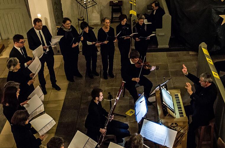 Unter der Leitung von Sigurd Knopp, der auch den Continuo-Part an der Truhenorgel übernahm, sang die hörbar sorgfältig einstudierte Kantorei Heilig-Kreuz, die solistischen Vokalpartien sangen Hedwig Porsch und Lorenz Kleefeld. Die instrumentale Begleitung übernahmen Sandra Schäfer-Küpferling (Querflöte), Adrian Küpferling (Fagott) und Frithjof Greiner (Violine).