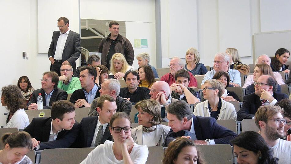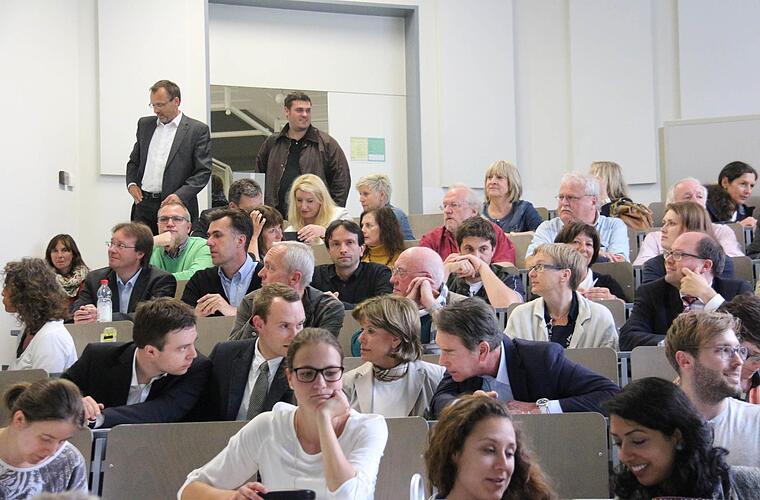 Michael Stoschek hatte sich laut Hochschule für die Veranstaltung angemeldet, nachdem er in der Zeitung davon gelesen hatte. Deshalb waren für ihn und seine Frau Plätze reserviert worden, wie für die Pressevertreter. Für die Studierenden wurden die ersten drei Hörsaalreihen freigehalten, damit sie noch Platz finden. Eine vorausschauende Maßnahme - denn die Reihen waren schon kurz vor Beginn der Veranstaltung voll besetzt; wer nach studentischer Tradition "ct" kam ("cum tempore"), also einer Viertelstunde nach 18 Uhr, musste stehen oder mit Treppenstufen vorlieb nehmen.
