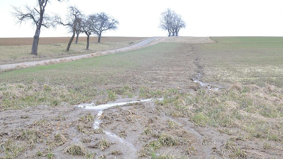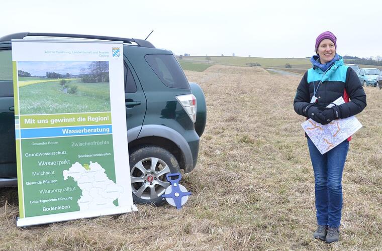"Im Landkreis Coburg ist der Raum Meeder mit den Wassereinzugsflächen der Fließgewässer Sulzbach und Nerde eines der oberfränkischen Modellgebiete Gewässerschutz", erklärte Gesche Petersen. Sie ist eine von vier Wasserberatern in Oberfranken. Am Beispiel einer Ackerfläche erklärte sie vor Ort die Wirkung von Erosionsschutzstreifen. Landwirte erhalten Förderung, wenn sie solche Streifen anlegen. Das kann entlang von Gewässern geschehen oder an Ackerflächen im Gefälle. Ziel ist stets, durch einen Vegetationsstreifen zu verhindern, dass ausgewaschene Bodenbestandteile in Gewässer gespült werden. "Die Erosion der Ackerfläche wird dadurch allerdings nicht verhindert", stellte Gesche Petersen klar. Eine deutliche Erosionsrinne im Acker oberhalb der Beispielfläche und ausgeschwemmter Boden, der im Grünstreifen hängen geblieben ist, zeigt deutlich, was sie damit meint.