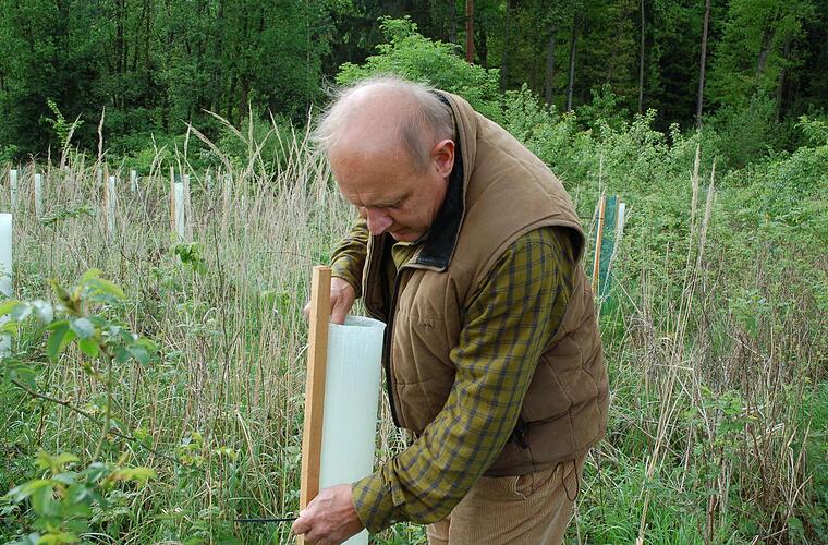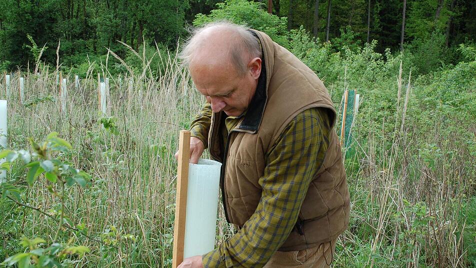 Auf der Versuchsfläche ragen eine ganze Menge solcher Plastikröhren auf, die als Einzelschutz für die Bäumchen angebracht wurden, damit sie nicht vom Wild verbissen werden. Nicht in jeder Röhre steckt der ungewöhnliche Baumhasel. Es gibt Winterlinden, Eichen, Weißtanne und sogar eine Fläche mit Birkensaat. "Es war die Idee von Heinrich Wimmer, hier mal eine Versuchsfläche anzulegen", erklärt Albert Schrenker. Wimmer ist der Waldbauspezialist der Bayerischen Staatsforsten.