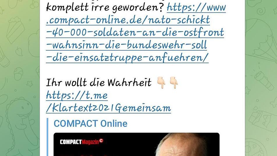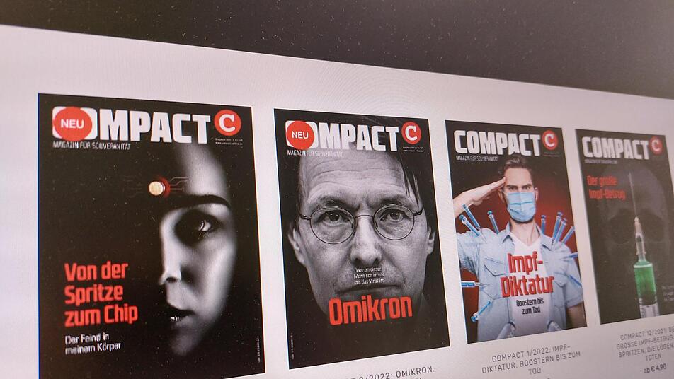Die Propaganda-Masche auf die Spitze treibt das Compact-Magazin - ein Hochglanz-Monatsheft, das vom Bundesamt für Verfassungsschutz im Dezember 2021 als "gesichert rechtsextrem" eingestuft worden ist. Zur Erklärung: Das Compact-Magazin unter seinem als rechtspopulistisch eingestuften Herausgeber Jürgen Elsässer bezeichnet sich selbst als "wichtigste Kraft des Widerstands" und veröffentlicht Coverstorys wie "Von der Spritze zum Chip" oder "Impf-Diktatur: Boostern bis zum Tod". Im dazu gehörenden Onlineshop gibt es nicht nur "Geschichtsbücher" mit vielsagenden Titeln wie "Mit Blut und Eisen" oder "Die geplante Vernichtung" (des deutschen Volkes, Anm. der Red.) zu kaufen, sondern auch Buttons ("Erkennungszeichen der neuen Freiheitsbewegung"), T-Shirts mit den Aufdrucken "Sieg/Freiheit für Deutschland!" und Plakate, die zum Impfstreik aufrufen. Besagtes Plakat wird auf dem Coburger Freiheitsboten-Kanal mit den Worten "Mit diesem Plakat seid ihr ein Blickfang auf jedem Spaziergang" beworben.