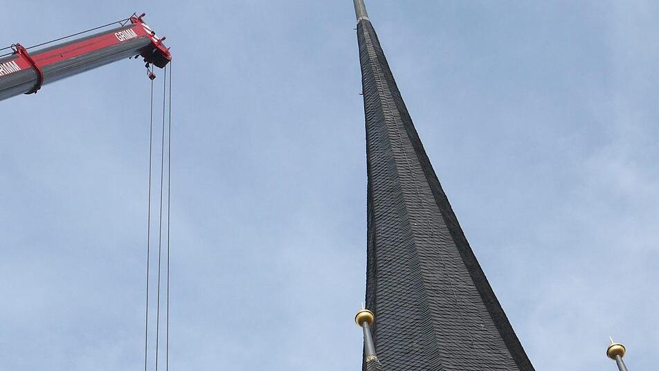 Die größte Herausforderung war nach Aussage Klinnerts die große Kirchenglocke: Die ist mit gut 1600 Kilo Gewicht (ohne Klöppel und Joch) nicht nur ein Schwergewicht, sondern war auch zu breit für den Zugang zur Kirchturmspitze. Deshalb wurde der Sandstein aufgestemmt, damit die Glocke durch das Fenster ins Innere gezogen werden konnte. Anfang der Woche, erklärte der Architekt, soll das Loch wieder zugemauert werden. Den Zeitplan sah er gestern gelassen: "Ich bin guter Dinge, dass wir wie versprochen bis Fronleichnam fertig werden."