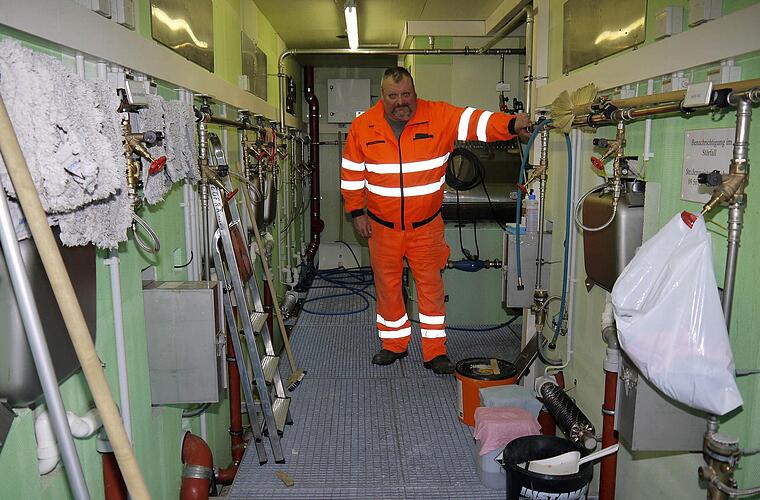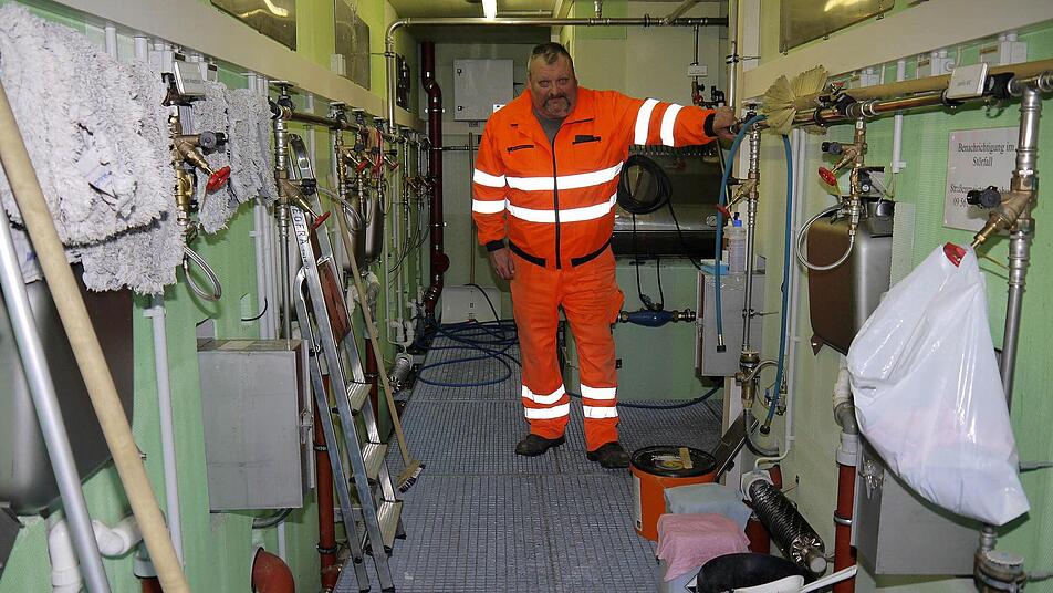 Nach einem Rundgang über den Parkplatz, ein paar kritischen Worten über Lkw-Fahrer ("Manche von denen sind zu faul, die paar Schritte aufs Klo zu laufen") und einer Anekdote über einen Autoschlüssel im dreieinhalb Meter tiefen Müllcontainer zieht Lothar Schardt seinen Schlüsselbund aus der Hosentasche und öffnet eine für Verkehrsteilnehmer gesperrte Tür. Dahinter ist der prall gefüllte Technikraum für die Toilettenanlage - unglaublich viele Schalter, Ventile, Putzmittel und ein Hochdruckreiniger. "Die Leitungen sind beheizt, das ist alles hochsensibel hier", sagt Schardt beiläufig.