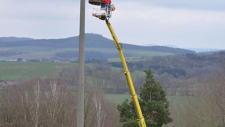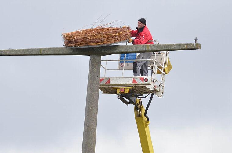 Doch ganz so ohne Probleme ging es dann doch nicht. Als Thomas Fiebich mit dem Storchennest oben ankam, musste er ersteinmal feststellen, dass der Mast ausgerechnet in der Mitte einen großen Stahlbolzen hat, auf dem die Nisthilfe irgendwie herumeierte. So würde wohl kaum ein Storch wohnen wollen.Fiebich und Günther mussten nun schauen, dass sie das Nest mit den mitgebrachten Seitenhalterungen zuerst ausbalancieren und dann so befestigen, dass es nicht mehr wackelt. Am Ende gelang auch das. Das Angebot für ein Storchenpaar hielt.